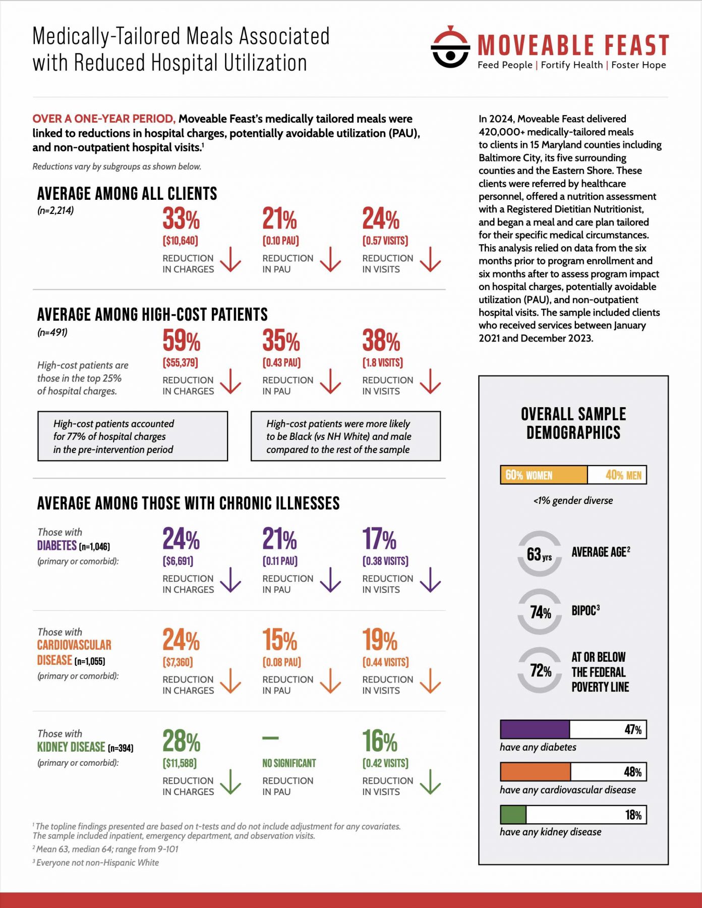 Participants who received Moveable Feasts MTMs saw a 33% reduction in hospital charges, an average savings of $10,640 per patient over six months. There was a 21% drop in potentially avoidable inpatient hospitalizations and a 24% reduction in hospital visits. Additionally, the top 25%of spenders, who accounted for 77% of charges in the six-month period before getting medically tailored meals, saw a 59% reduction in hospital charges. This amounted to an average savings of $55,379 per patient over six months.